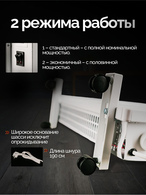 Обогреватель настенный работает в двух режимах: стандартном – с полной номинальной мощностью и экономичном – с половинной мощностью. Ступенчатая регулировка мощности осуществляется двумя рокерными (клавишными) переключателями, обеспечивающими независимое включение нагревателей.