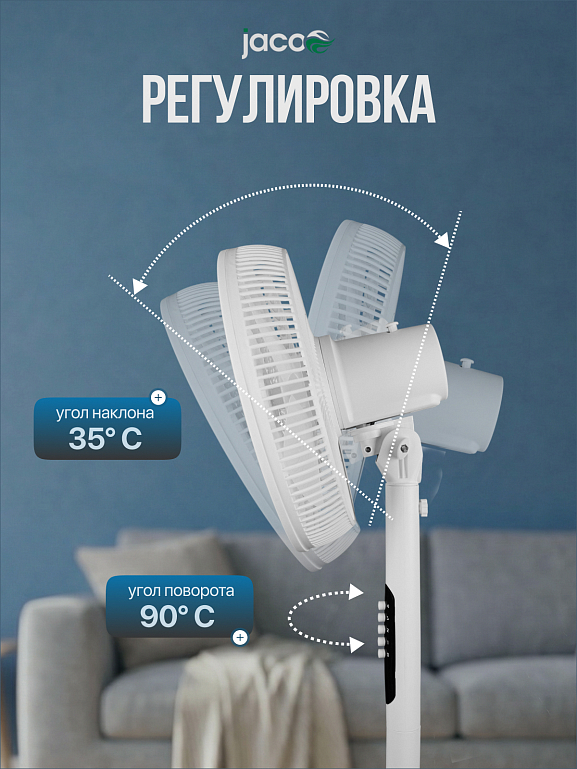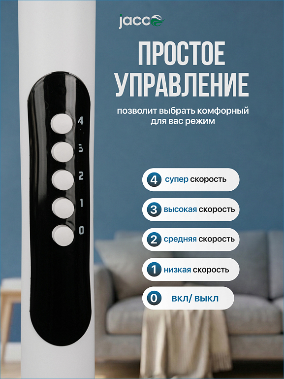 Мощность 60 Вт обеспечивает стабильный поток воздуха, а 4 режима работы помогают выбрать комфортную интенсивность охлаждения. Поворотный механизм равномерно распределяет воздух по помещению.