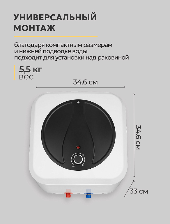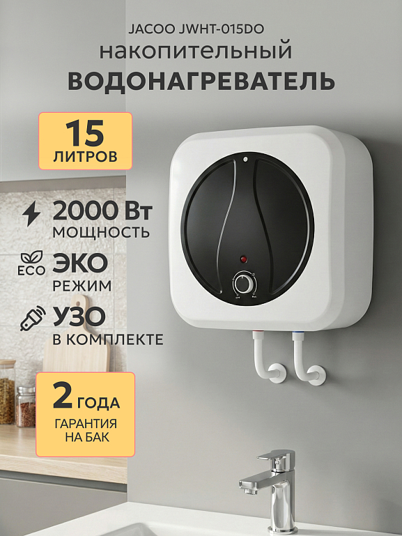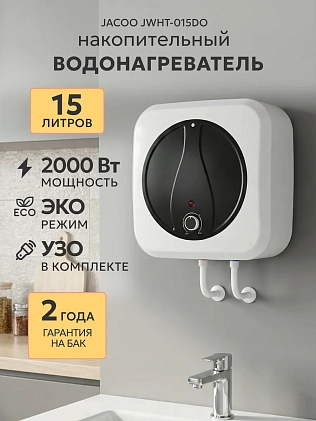 Электрический накопительный водонагреватель JACOO JWHT-015DO - это современное решение для обеспечения вашего дома горячей водой круглый год. Наш бойлер рассчитан на 15 литров. Благодаря накопительной системе, устройство сохраняет оптимальный объем воды и поддерживает её температуру длительное время, что экономит электроэнергию и ваши средства. Данная модель устанавливается над раковиной и имеет нижний способ подачи воды. Электрический нагреватель для горячей воды характеризуется мощностью 2000 Вт, что обеспечивает нагрев воды до 45°С в течение 15 минут. Бойлер электрический способен нагревать воду до 35-75°С. Во избежание перегрева предусмотрена система автоматического отключения и включения. Главное конкурентное преимущество этого бойлера – плоский корпус и компактный размер, который позволяет установить его даже в ограниченном пространстве. Бак вмещает объем на 15 литров, выполнен из нержавеющей стали. А сам материал имеет антикоррозийное свойство, что значительно продлевает срок службы прибора. Надежная система защиты предотвращает перегрев и избыточное давление, делая эксплуатацию максимально безопасной для пользователей. Удобная панель управления позволяет легко выбирать нужный температурный режим. Электроводонагреватель (ЭВН) подходит как для постоянного, так и для временного применения в жилых помещениях, гостиницах, салонах красоты, парикмахерских и др. Выбирая этот водонагреватель на 15 литров, вы получаете практичность, безопасность и экономию электроэнергии. Бойлер для воды имеет следующие габариты: высота 34,6 см, ширина 34,6 см, глубина 33 см. Убедитесь сами в эффективности и долговечности нашего оборудования для нагрева воды!